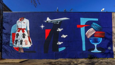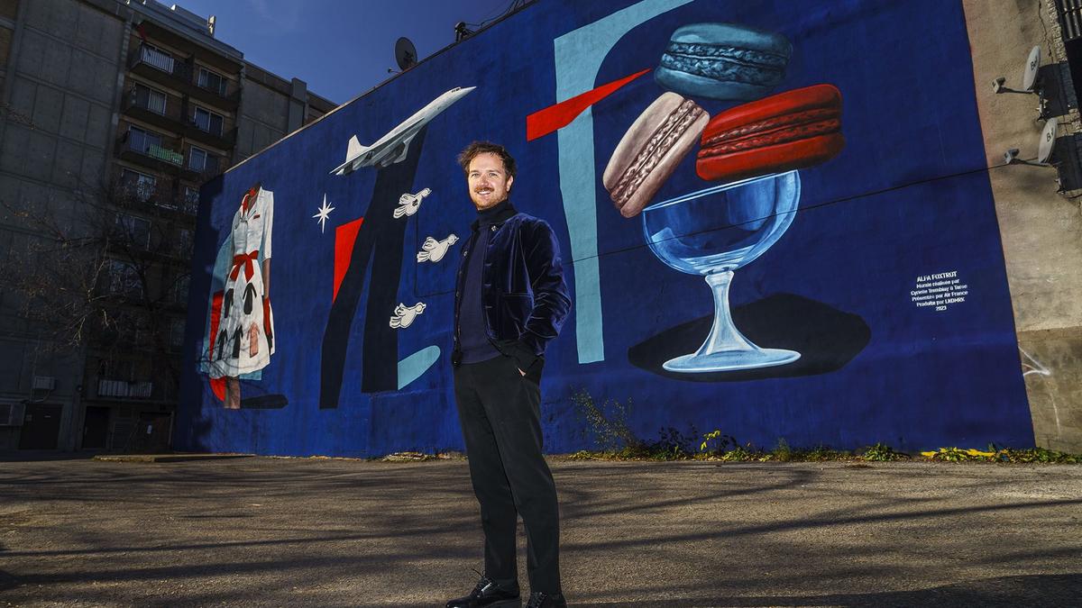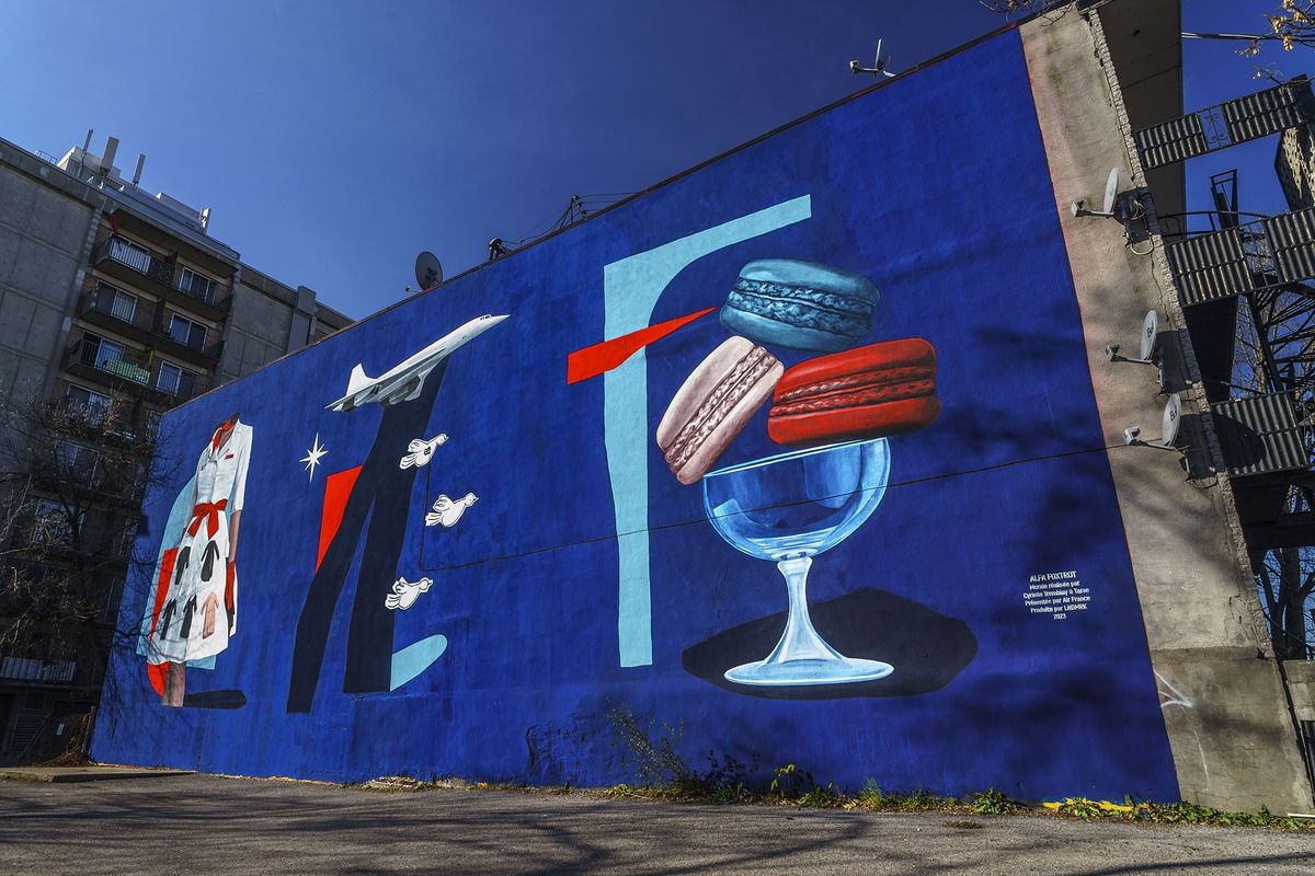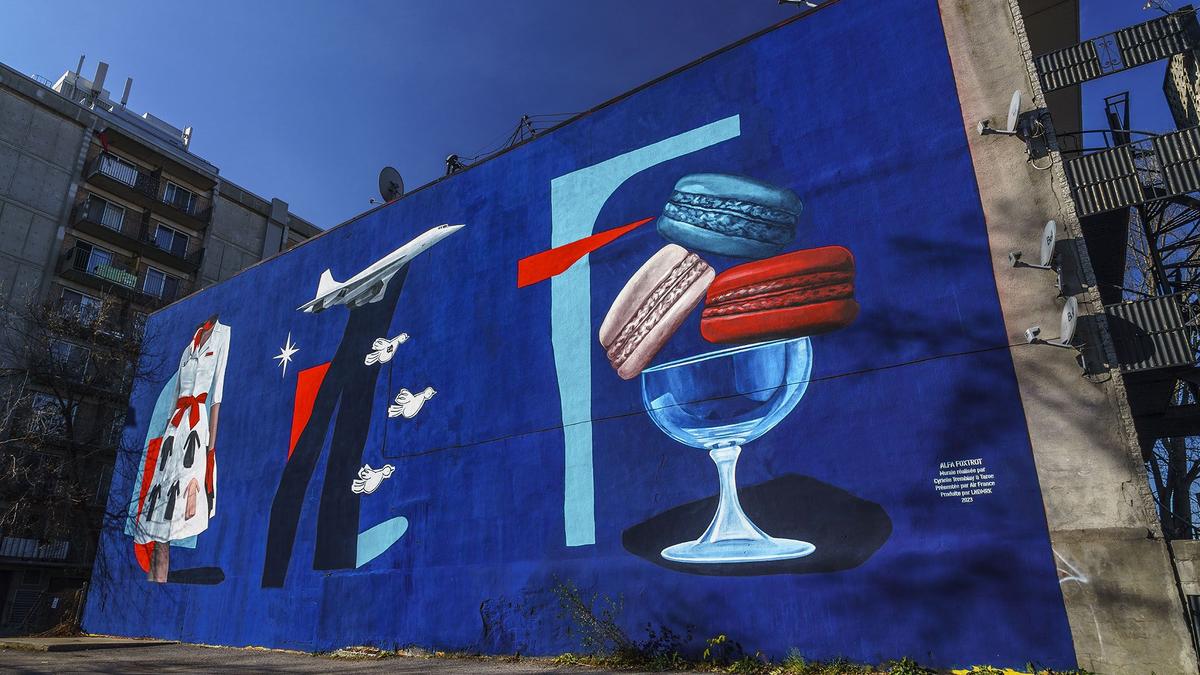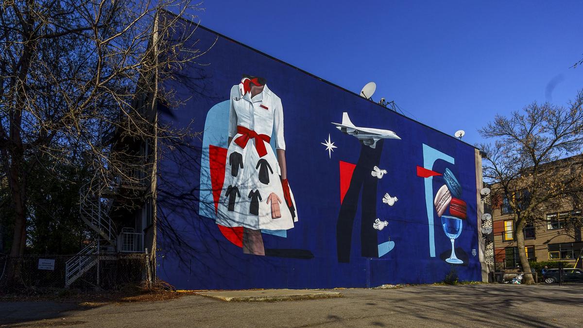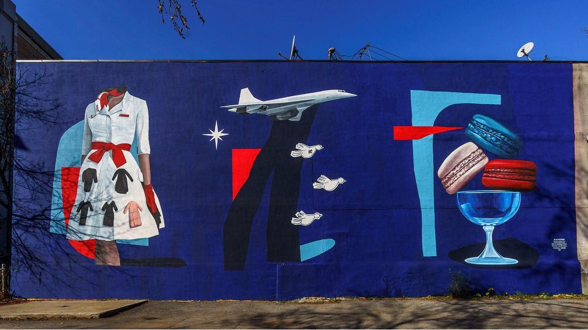 Pour souligner les 90 ans de la compagnie créée en 1933, Air France Canada a inauguré la murale ‘Alfa Foxtrot’ reprenant des éléments de son patrimoine. Peinte à l'angle des rues de la Visitation et La Fontaine, la murale est le fruit d'une collaboration d’un duo canadien et français : Cyrielle Tremblay et Taroe.