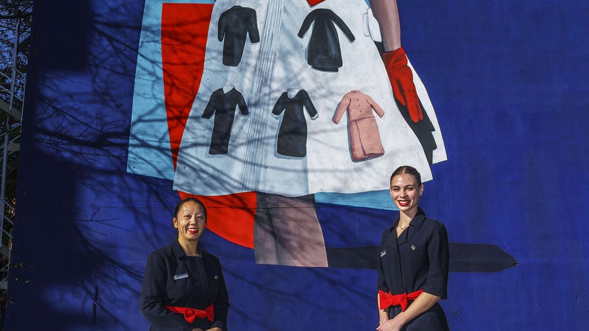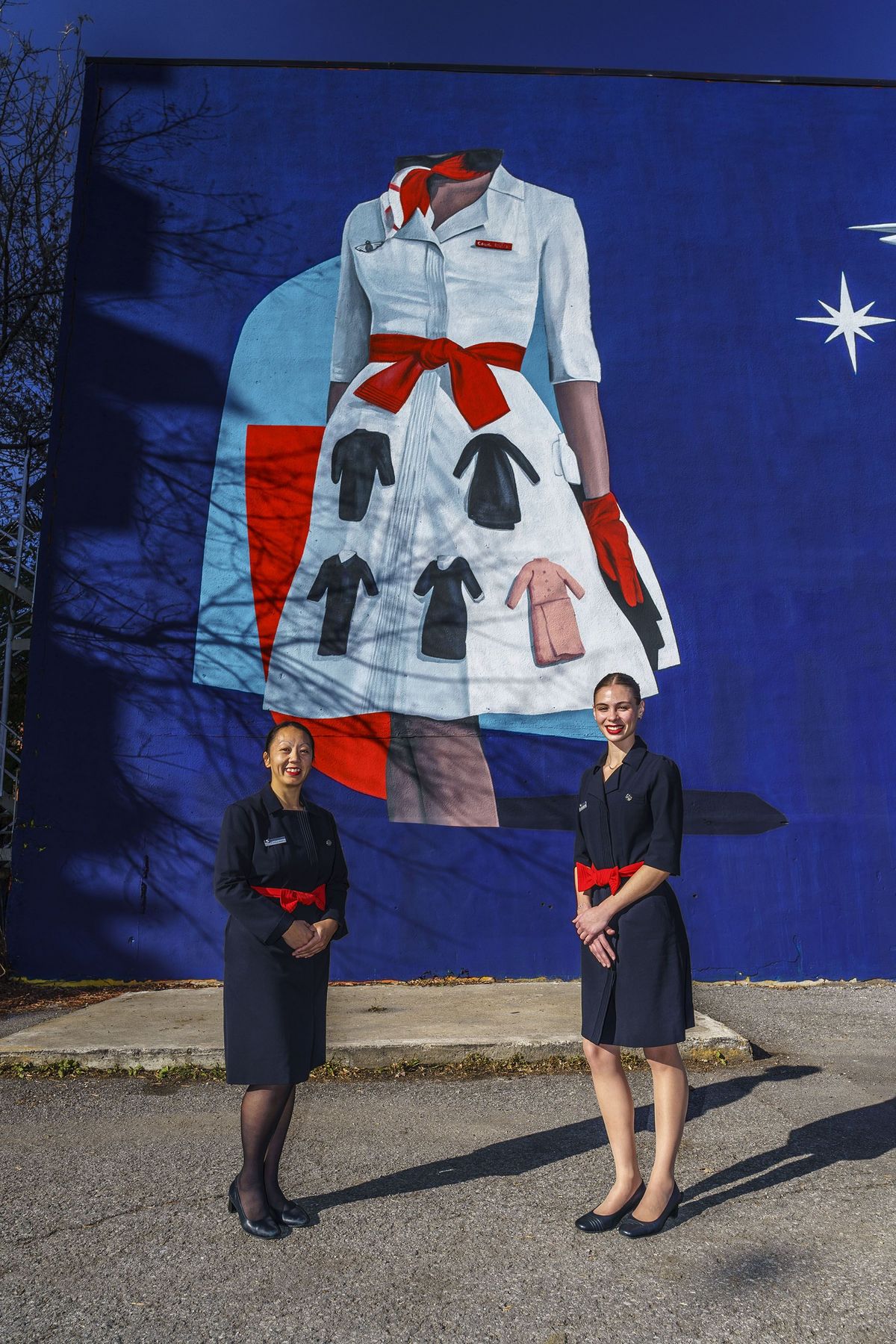 Cette murale de 160 mètres carrés (1750 pc), où dominent les couleurs de la compagnie, incarne les 90 ans d’élégance, de technologie, de confort et de gastronomie en vol. La robe à gauche fait partie d’une collection de cinq robes iconiques réalisées par Xavier Ronze, créateur français et responsable des ateliers costumes pour le ballet de l’Opéra national de Paris. Elle illustre l’évolution des uniformes de la compagnie au fil des décennies tout en immortalisant l’héritage de la haute couture dans l’identité d’Air France. Au centre, pour honorer les prouesses technologiques, on retrouve le Concorde, symbole d’innovation et de progrès aéronautique. Enfin, les macarons et la coupe à droite mettent en valeur la gastronomie française à travers le monde et à bord d’Air France.