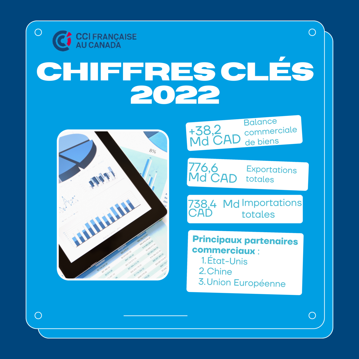 Malgré le ralentissement de l’économie mondiale, l’année 2022 a confirmé la dynamique de 2021, avec des #exportations et des #importations en forte hausse (respectivement +21,8 et +20%), ce qui consolide l’excédent commercial du pays (38,2 Md CAD - 26,3 Md€, soit 2 fois et demi celui de 2021).