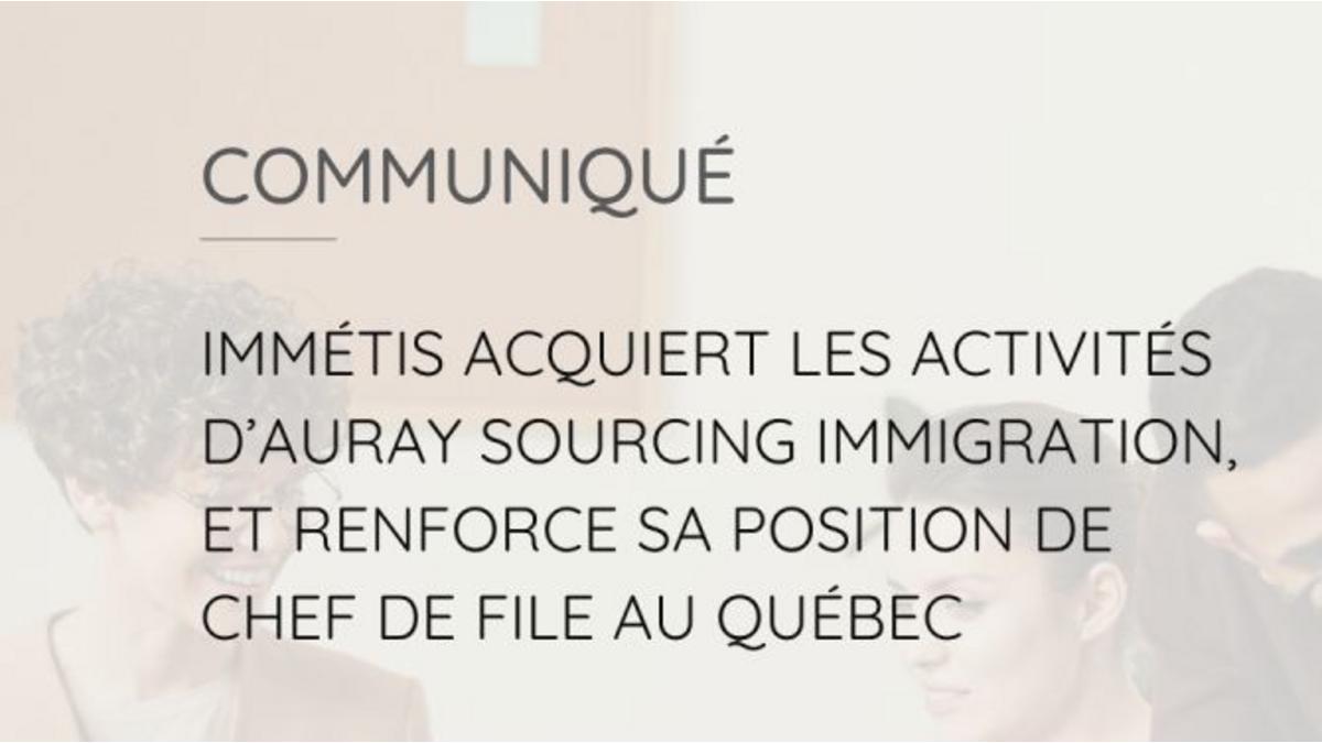 Immétis a récemment fait l’acquisition des activités en immigration et recrutement international d’AURAY Sourcing Immigration, filiale du Groupe Raymond Chabot Grant Thornton. Cette intégration s’inscrit dans la continuité de la croissance d'Immétis et va leur permettre non seulement d’élargir l'offre de services, mais aussi de renforcer leur présence dans plusieurs provinces du Québec et de l’Ontario.