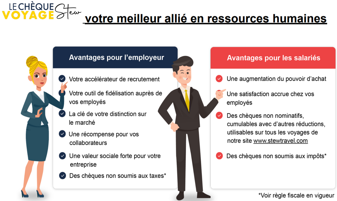 Les employés peuvent utiliser le chèque voyage Stew sur notre site www.stewtravel.com. Le chèque n’étant pas nominatif, il peut être utilisé par toute la famille. Grâce à vous, le pouvoir d’achat de votre collaborateur augmente !