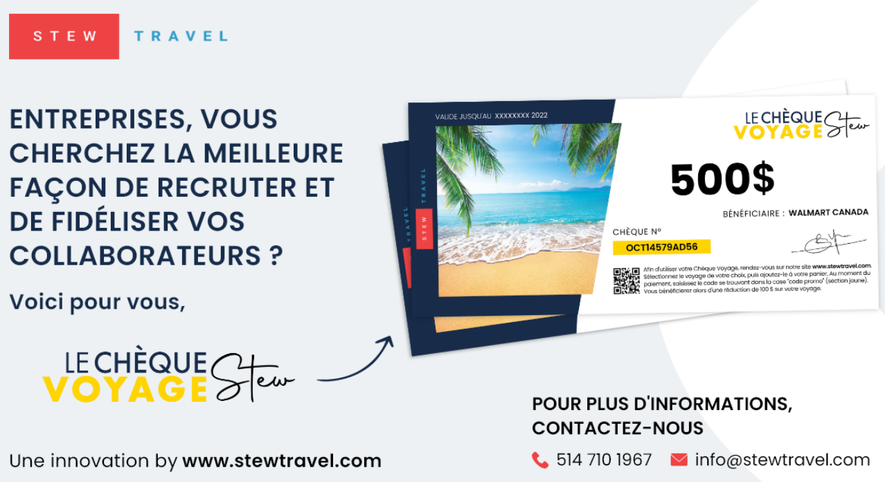 Le concept est simple : nous vous proposons d’acheter à moindre coût des chèques voyages d’une valeur de 100$, 250$ ou 500$. Vous pourrez ensuite offrir ces chèques voyages à vos employés. À vous de jouer !