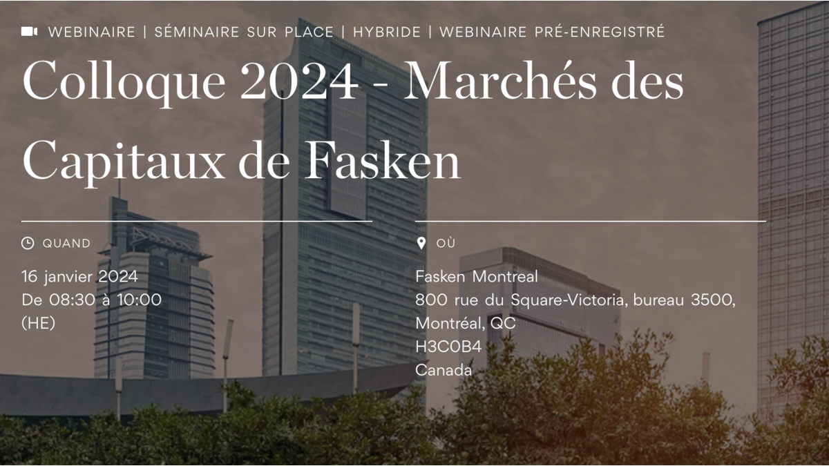 Fasken est ravie de vous convier à l'édition 2024 de leur Colloque - Marchés des Capitaux, le 16 janvier 2024 de 8h30 à 10h00