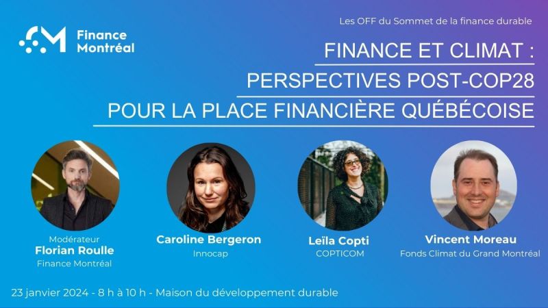 Finance Montréal vous invite à participer à un « OFF du Sommet de la Finance Durable » spécial COP28 le 23 janvier 2024, de 8 h à 10 h.