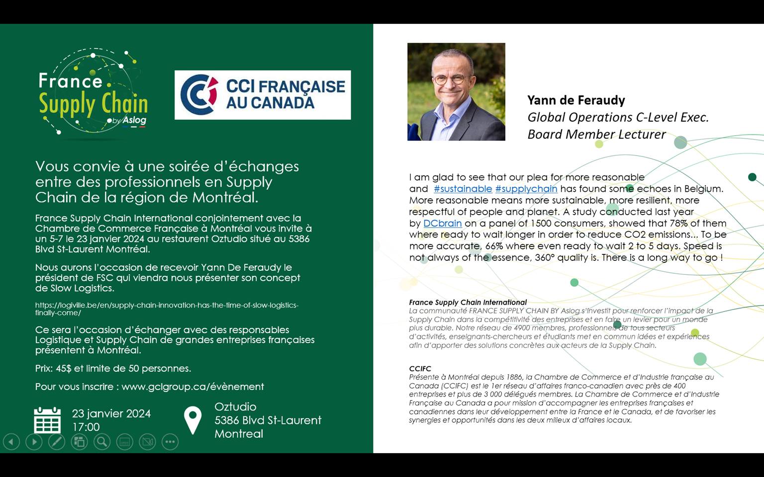France Supply Chain International conjointement avec la CCIFC vous invite à un 5@7 le 23 janvier au restaurant Oztudio situé au 5386 Blvd St-Laurent Montréal.