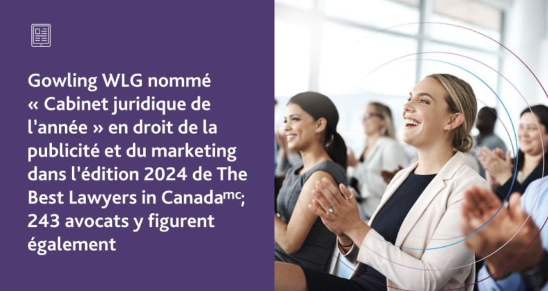 Best LawyersMD a nommé Gowling WLG « Cabinet juridique de l’année » au Canada en droit de la publicité et du marketing pour 2024. Il s’agit de la troisième année consécutive que Best LawyersMD décerne ce prestigieux titre au cabinet pour son travail dans le domaine.