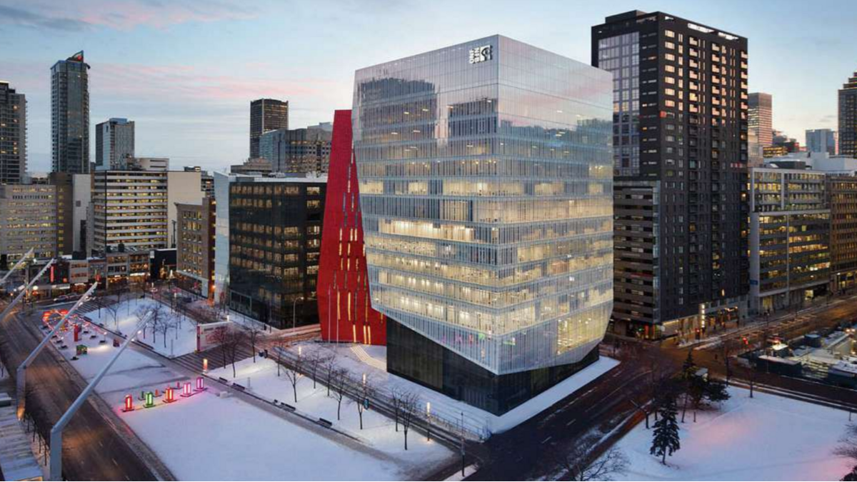 D’une superficie de plus de 339 000pi2, cet immeuble de la Société d'habitation et de développement de Montréal (SHDM) se caractérise par son immense brèche oblique rouge vif en plein centre du Quartier des Spectacles.