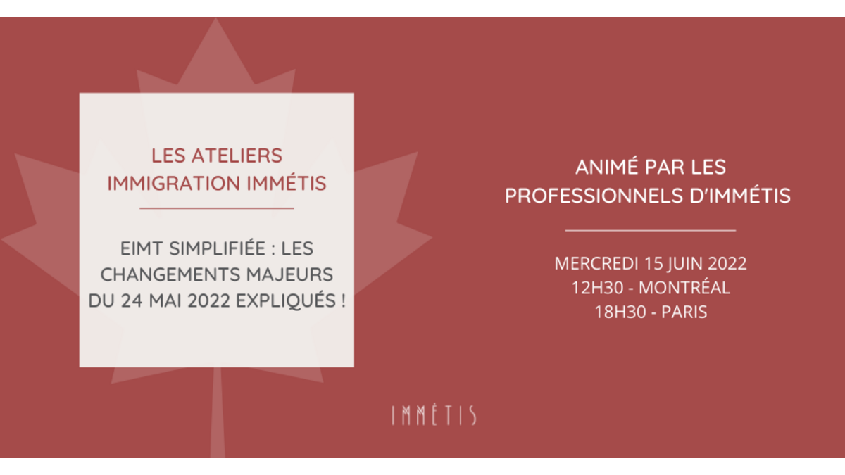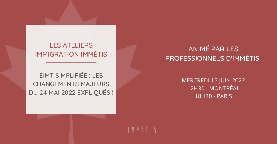 Le cabinet d'Avocats Immétis dédié à l'immigration et la mobilité internationale au Canada, organise un nouvel atelier d'Immigration qui portera sur l'EIMT simplifiée et les changements majeurs apportés le 15 juin 2022.