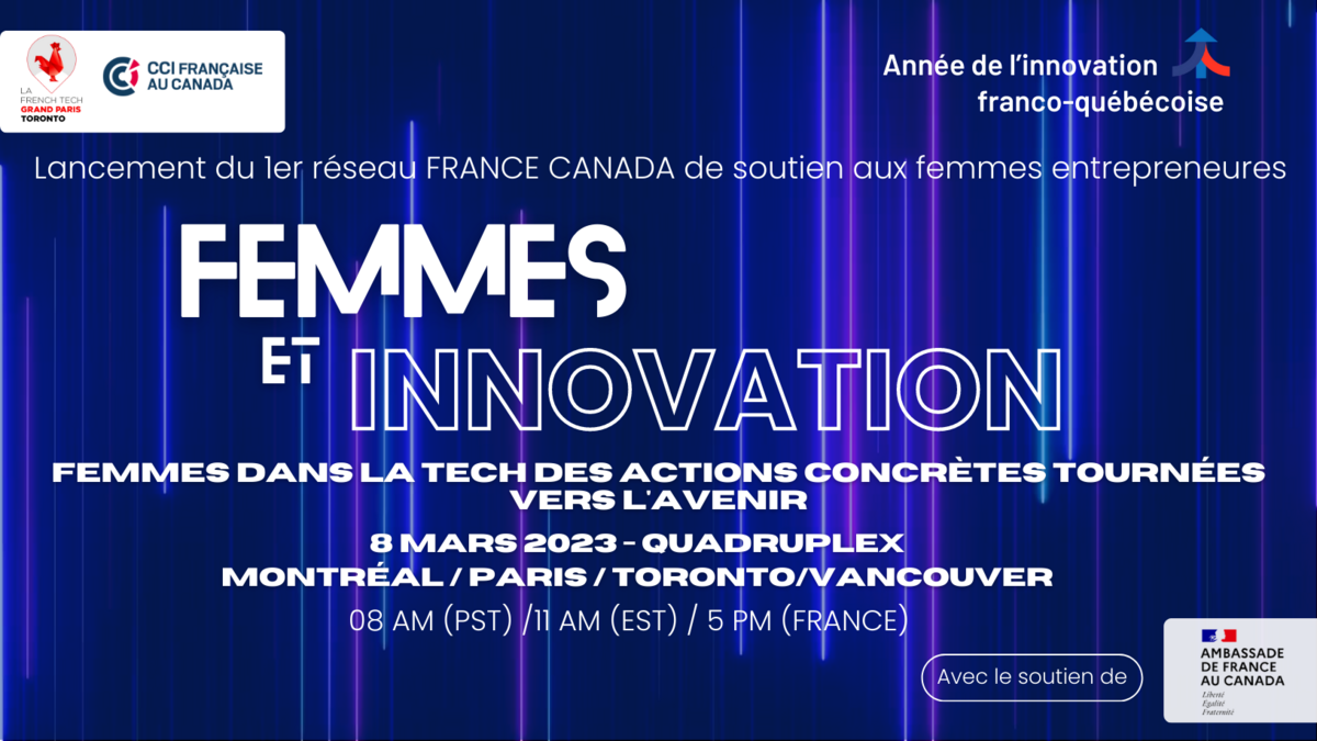 Dans le cadre de l'année de l'innovation franco-québécoise 2023, la CCI Française au Canada s'associe à la French Tech Toronto et à la French Tech Grand Paris pour un quadruplex exceptionnel, entre Montréal, Paris, Toronto et Vancouver, afin de partager les initiatives de leaders et entrepreneures de l'écosystème tech.