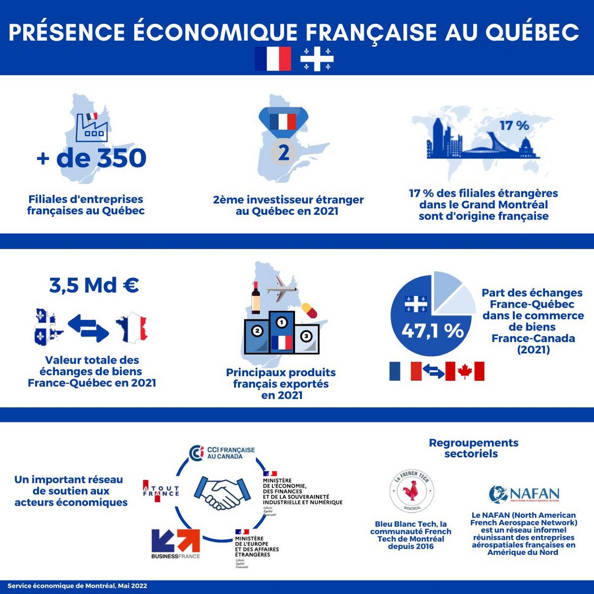 En 2021, la France est le 2ème investisseur étranger au Québec derrière les Etats-Unis. Avec près de 400 filiales, la présence française est visible dans presque tous les domaines. Le Québec conserve en 2021 son rang de principale province partenaire de la France au Canada avec 47,1 % des échanges de biens.