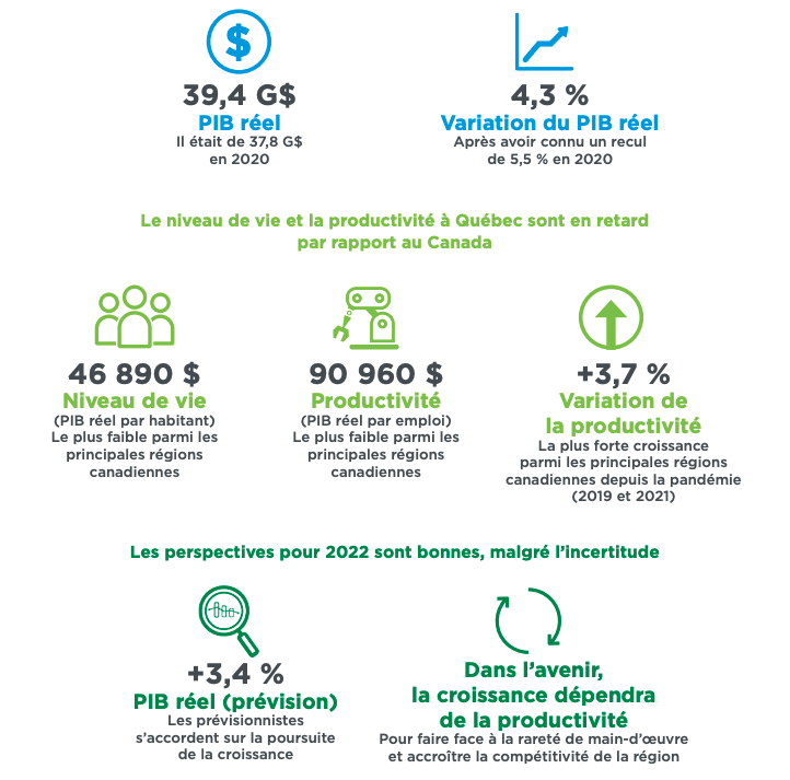 Québec International a publié le 21 juin 2022 le document « Bilan et perspectives » portant sur la croissance économique dans la région métropolitaine de recensement (RMR) de Québec. En s’appuyant sur les estimations du Conference Board du Canada visant le produit intérieur brut (PIB) de la RMR de Québec, l’Agence constate un rebond de l’économie de 4,3 % entre 2020 (37,8 G$) et 2021 (39,4 G$), soit le plus important enregistré en plus de 20 ans.