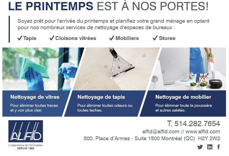Faites place à la propreté, confiez votre grand ménage du printemps au service d'entretien Alfid Services Immobiliers Ltée.