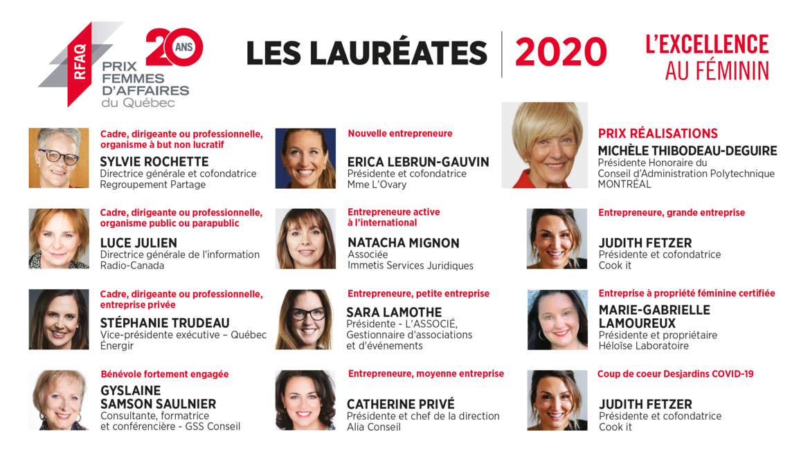 Le Réseau des Femmes d’affaires du Québec, en collaboration avec Desjardins, EY, le Gouvernement du Québec, Nelly De Vuyst et VIA Rail Canada présentait le 17 novembre son gala annuel Prix Femmes d’affaires du Québec pour la 20ème fois. Devant un parterre virtuellement composé de femmes et d’hommes d’affaires présents pour les ovationner, les 33 finalistes ont été honorées et les 11 lauréates ont été dévoilées.