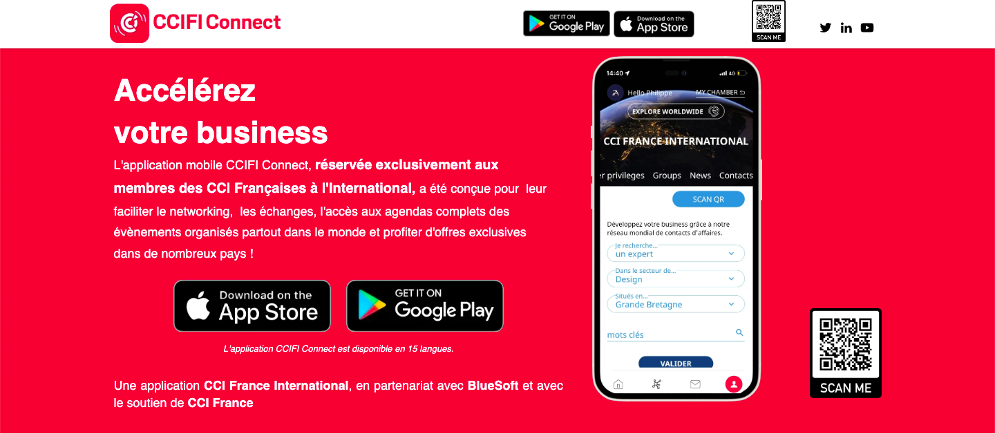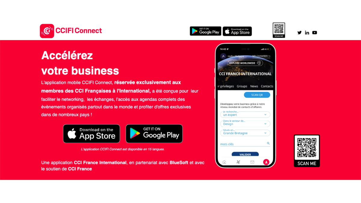 L'application mobile CCIFI Connect, réservée exclusivement aux membres des CCI Françaises à l'International, a été conçue pour leur faciliter le networking, les échanges, l'accès aux agendas complets des évènements organisés partout dans le monde et profiter d'offres exclusives dans de nombreux pays !