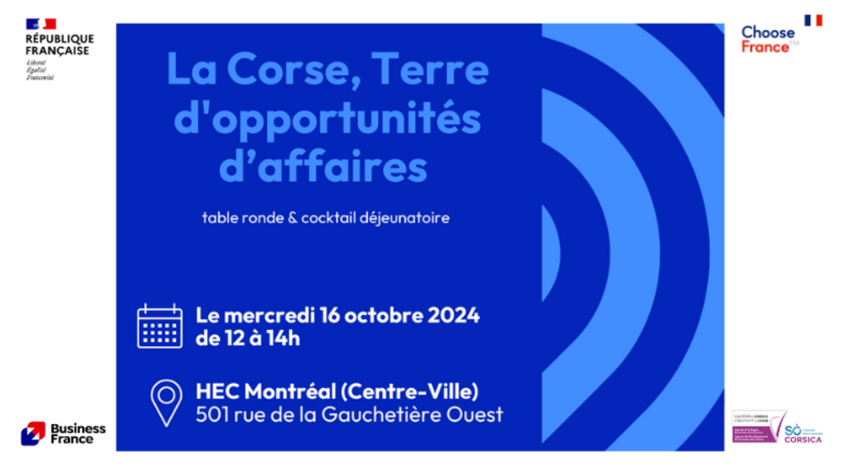 Business France, en collaboration avec l'ADEC (Agence de Développement Économique de la Corse), a le plaisir de vous inviter à un séminaire d'attractivité autour de la Tech et de l'économie bleue, destiné aux entreprises canadiennes.