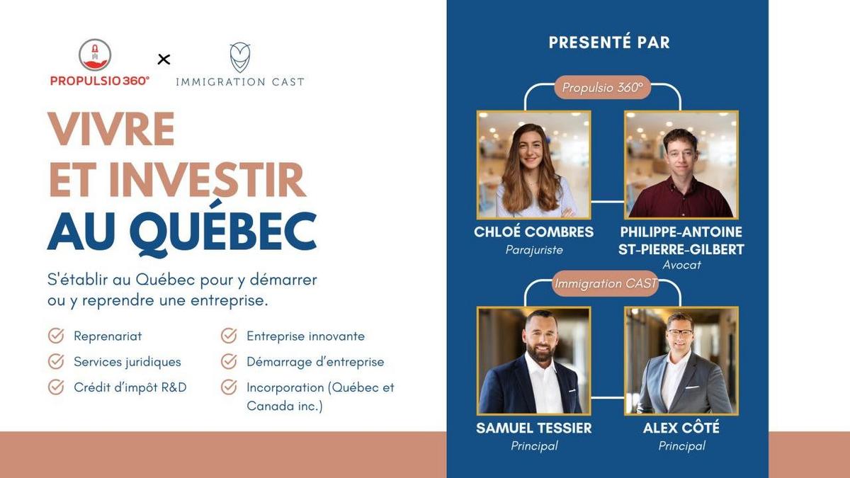 Propulsio 360° organise une conférence le 2 octobre de 10h à 11h15 sur l'immigration d'affaires et ses enjeux juridiques au Québec.