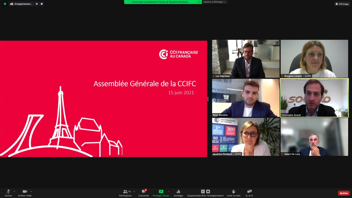 L'Assemblée Générale de la CCIFC s'est déroulée ce mardi 15 juin 2021 à 17h30 avec Christophe Airault (Président du CA), Albert De Luca (membre du Comité Éxécutif, Trésorier), Luc Papineau (membre du comité de nomination) et Sandrine Perreault (Directrice de la CCIFC et membre du Comité Éxécutif) qui ont présenté l'ordre du jour.