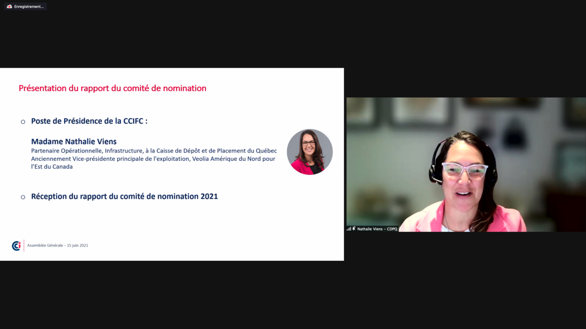 La nouvelle présidence du conseil a également été votée ; nous félicitons Madame Nathalie Viens, Partenaire Opérationnelle, Infrastructure, à la Caisse de Dépôt et de Placement du Québec qui prend la suite de Monsieur Christophe Airault, Vice-président principal, Services aux entreprises de Sodexo en tant que Présidente de la CCIFC.