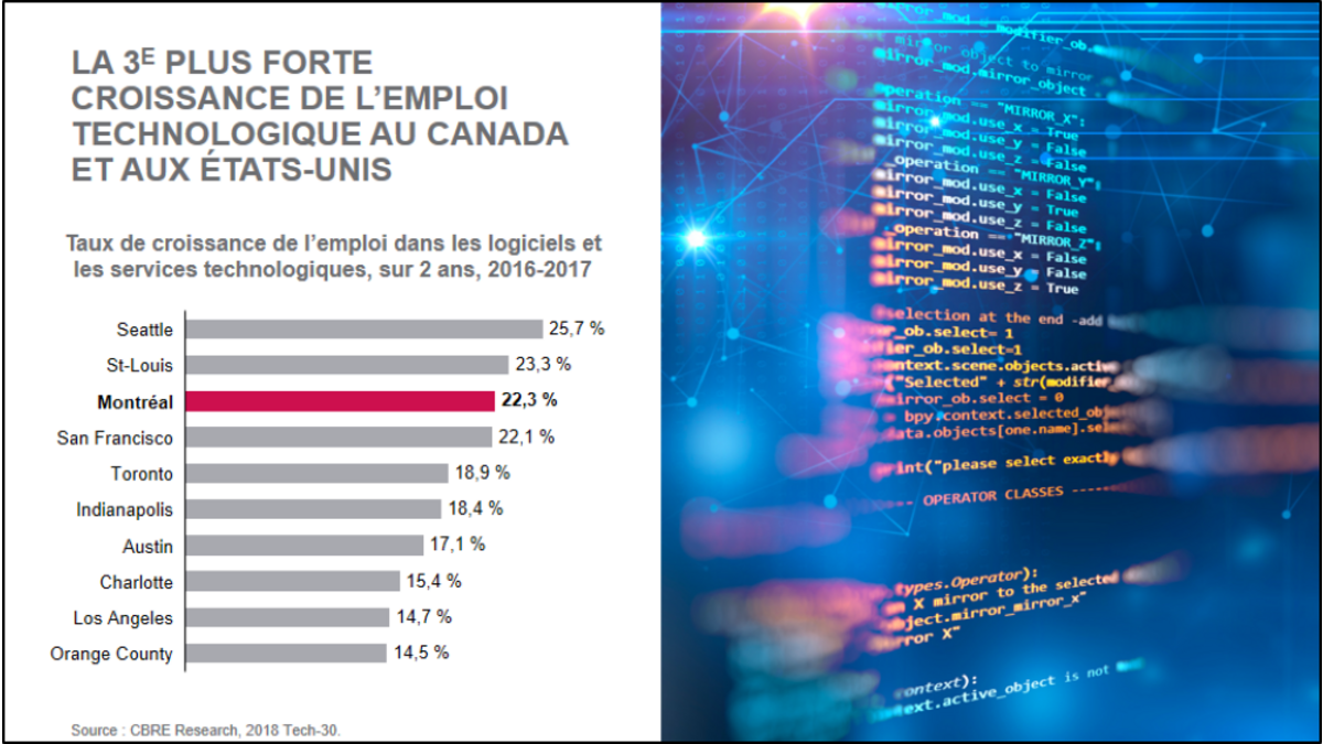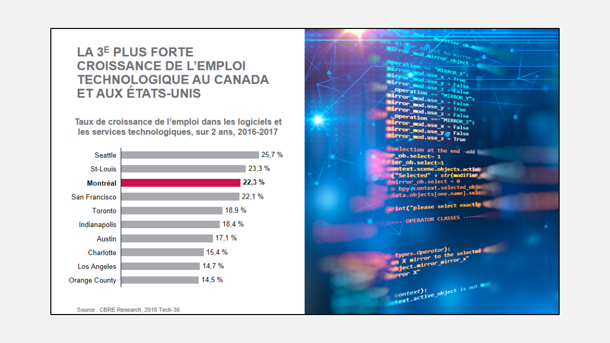 Le principal moteur de cette croissance de l’emploi est dû au secteur de la haute technologie. En effet, sur ce secteur, la croissance du nombre d’emplois à Montréal a été de 22 % en 2016 et 2017, juste derrière Seattle et St-Louis. Les secteurs de haute technologie (TIC, aérospatiale et SVTS) sont les piliers économiques du Grand Montréal avec plus de 1,5 milliards $ d’investissements étrangers, soit 62 % des résultats 2018.