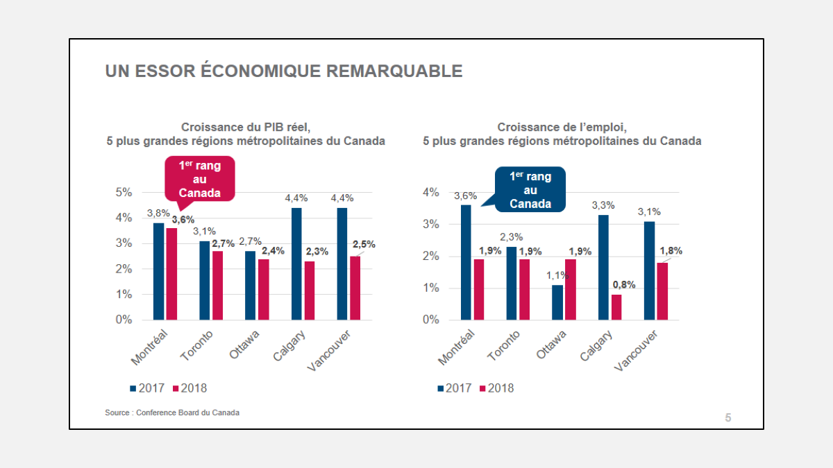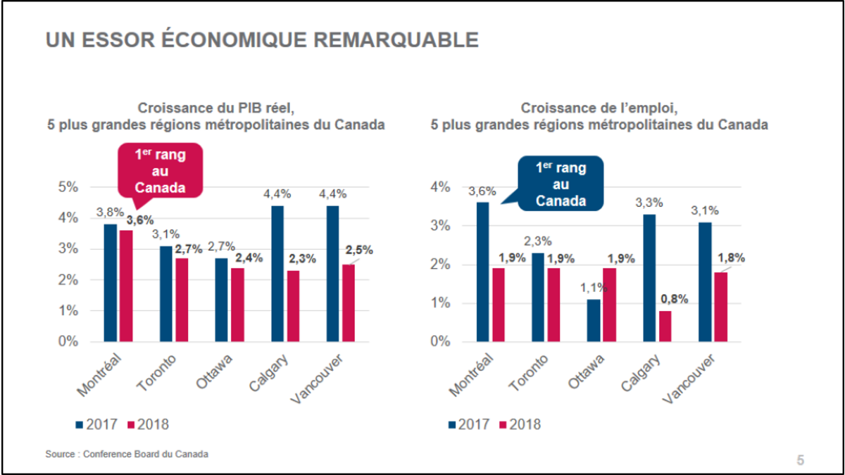 Le Grand Montréal vit un essor économique exceptionnel depuis quelques mois de par une croissance du PIB réelle (3,6% en 2018) et une croissance de l’emploi égale ou supérieur aux autres grandes villes canadiennes.