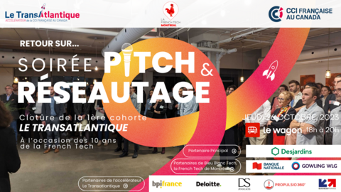 Jeudi 26 octobre, l'Accélérateur bilatéral de la CCI Française au Canada, le Transatlantiqueet Bleu Blanc Tech, la French Tech de Montréal ont organisé une soirée Pitch pour la 1ère cohorte du Transatlantique dans le cadre des 10 ans de la French Tech.