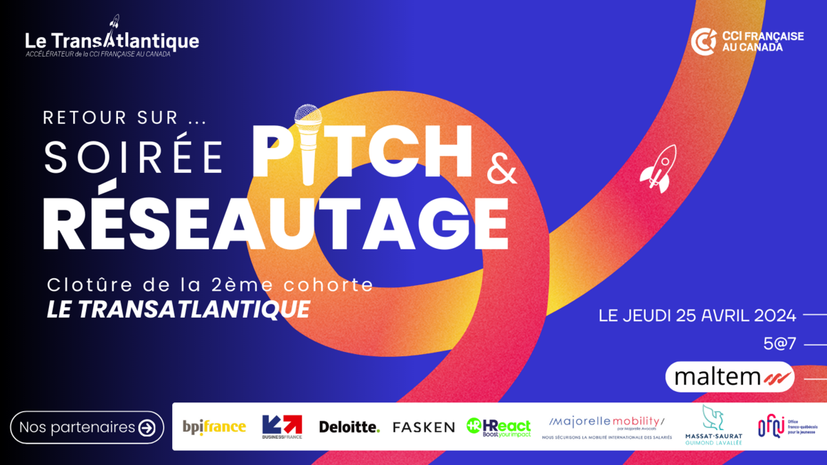 Jeudi 25 avril, l'Accélérateur bilatéral de la CCI Française au Canada, le Transatlantique a organisé une soirée Pitch pour sa 2ère cohorte, accueilli par Maltem !