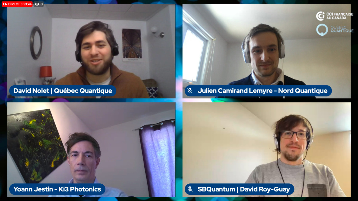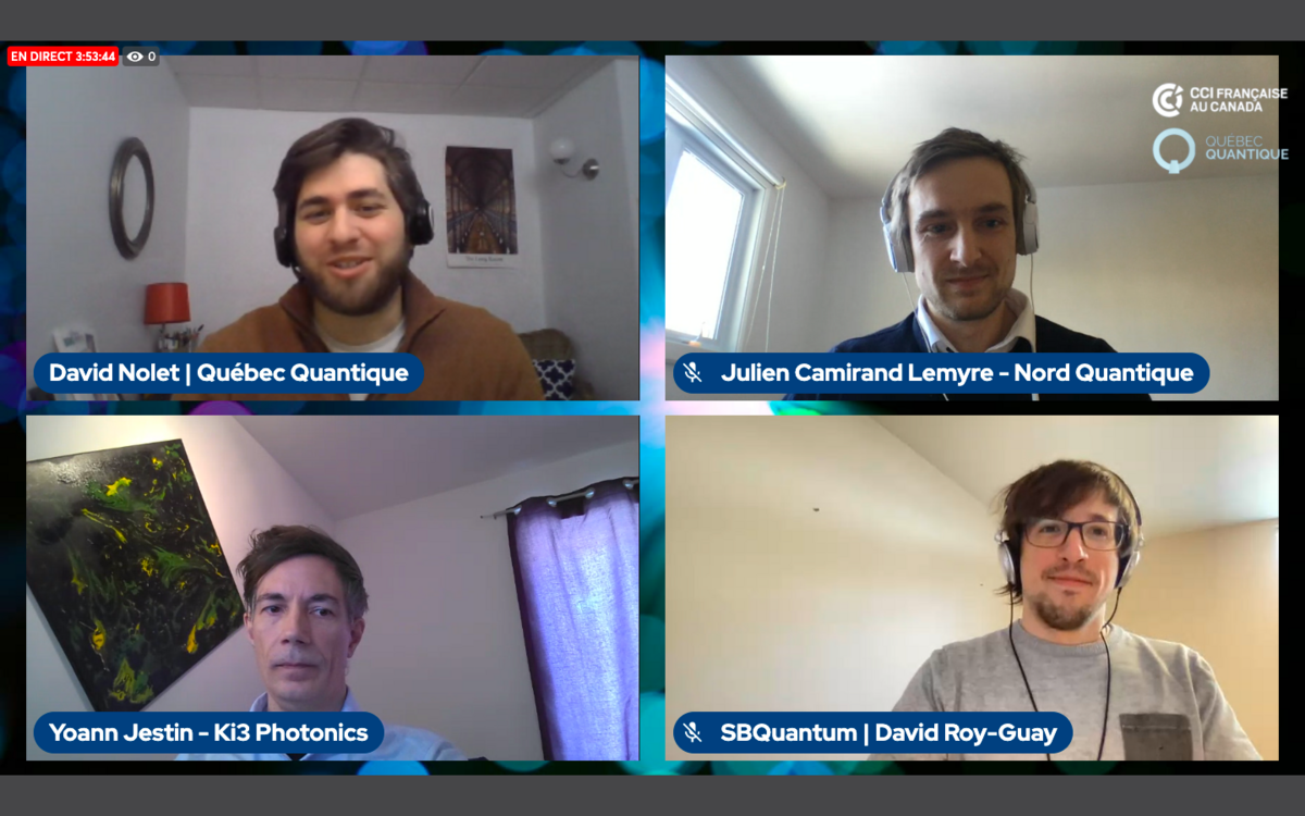 Au Québec, ce sont Julien Camirand Lemyre Président et Chef de la direction technologique Nord Quantique, Yoann Jestin PDG de Ki3 Photonics et David Roy-Guay PDG de SB Quantum qui se sont prêtés à l’exercice du pitch lors d'un panel animé par David Nolet Chargé de projet, entrepreneuriat pour Québec Quantique.