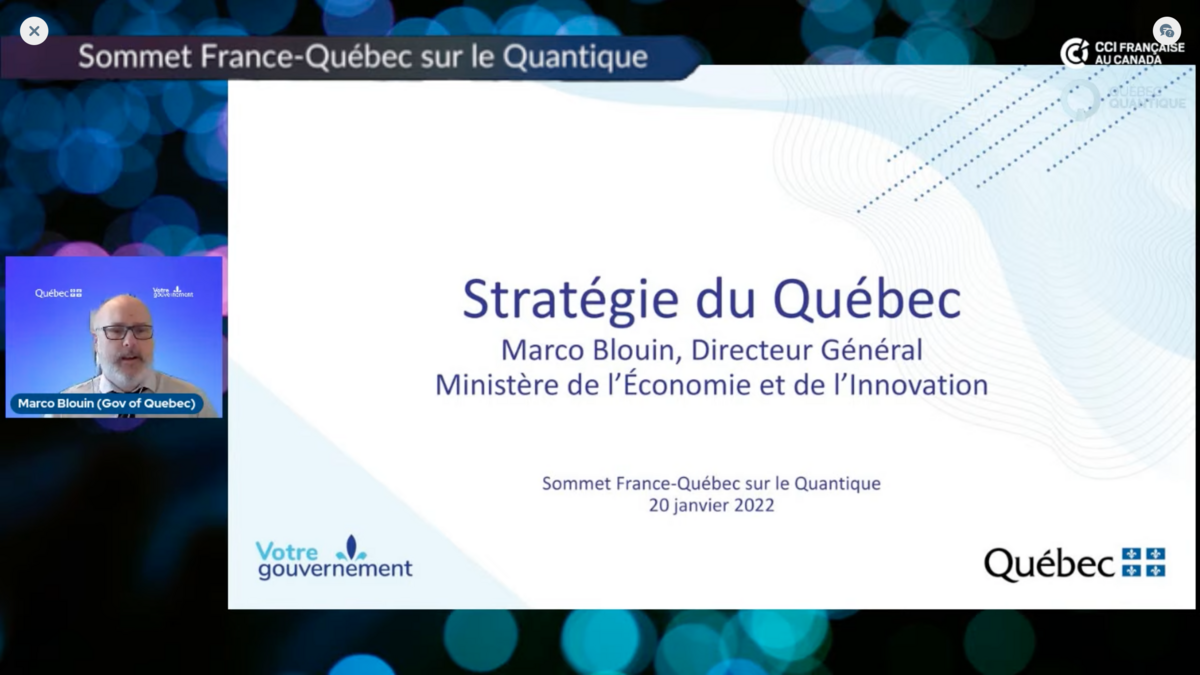 Marco Blouin, Directeur général de la Direction générale de la Science et de l'Innovation (MEI), acquiesce la position française de l’importance de la recherche et du développement industriel couplé au transfert de technologies. Selon lui, nous devons connaître une adoption massive des technologies quantiques de calibre mondial à l’aune de 2030, en fabrication, commercialisation et utilisation. Le Québec s’engage à aider le développement du secteur à travers le financement de 26 appels à projets et l’aide à la création de l’Institut Quantique - Espace IBM Q.