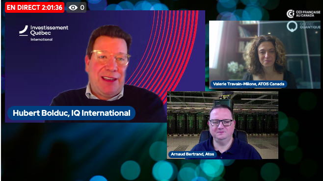 Dans le cadre de la conférence animée par Hubert Bolduc, Président d’Investissement Québec, Valérie Milone CEO Atos Canada et Arnaud Bertrand Vice-président senior du groupe et responsable de la stratégie et de l'innovation de BDS chez Atos, nous ont présenté la stratégie d’ATOS, leader en cyber sécurité et en IA, dans son développement et ses ambitions au Québec. Le quantique est selon eux une solution pour améliorer ce qui est déjà optimisé. M. Bertrand a appuyé l’intérêt des technologies dans la décarbonation des datas centers par la baisse de consommation d’énergie permise par les algorithmes quantiques. Le Québec est selon ATOS une terre riche dans ce domaine pour assurer cette évolution. La province dispose de ressources compétentes en quantique et en TI : ce qui est souvent très rare d’attacher les deux. Davantage, les financements des entreprises y sont intéressants. À terme, l’implantation d’un simulateur quantique au Québec ferait du sens pour permettre la formation universitaire et des équipes d’ATOS en Amérique du Nord.