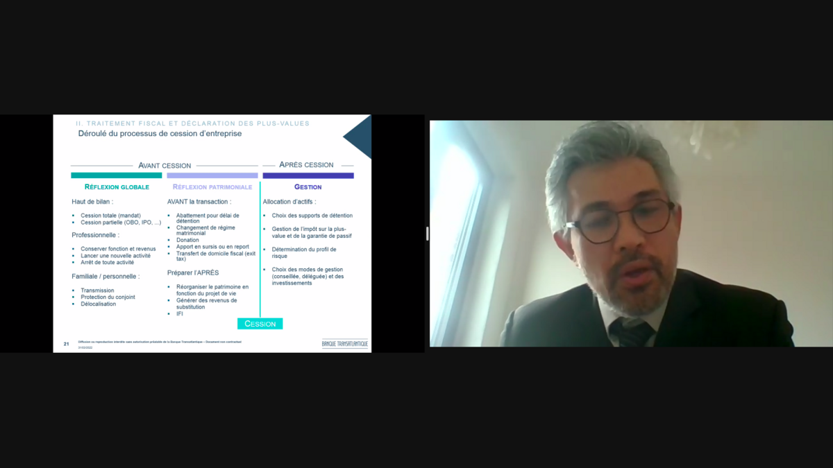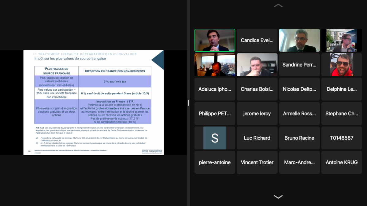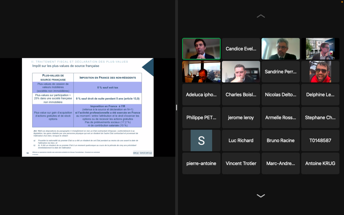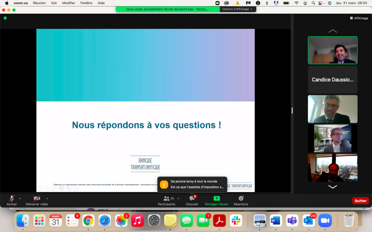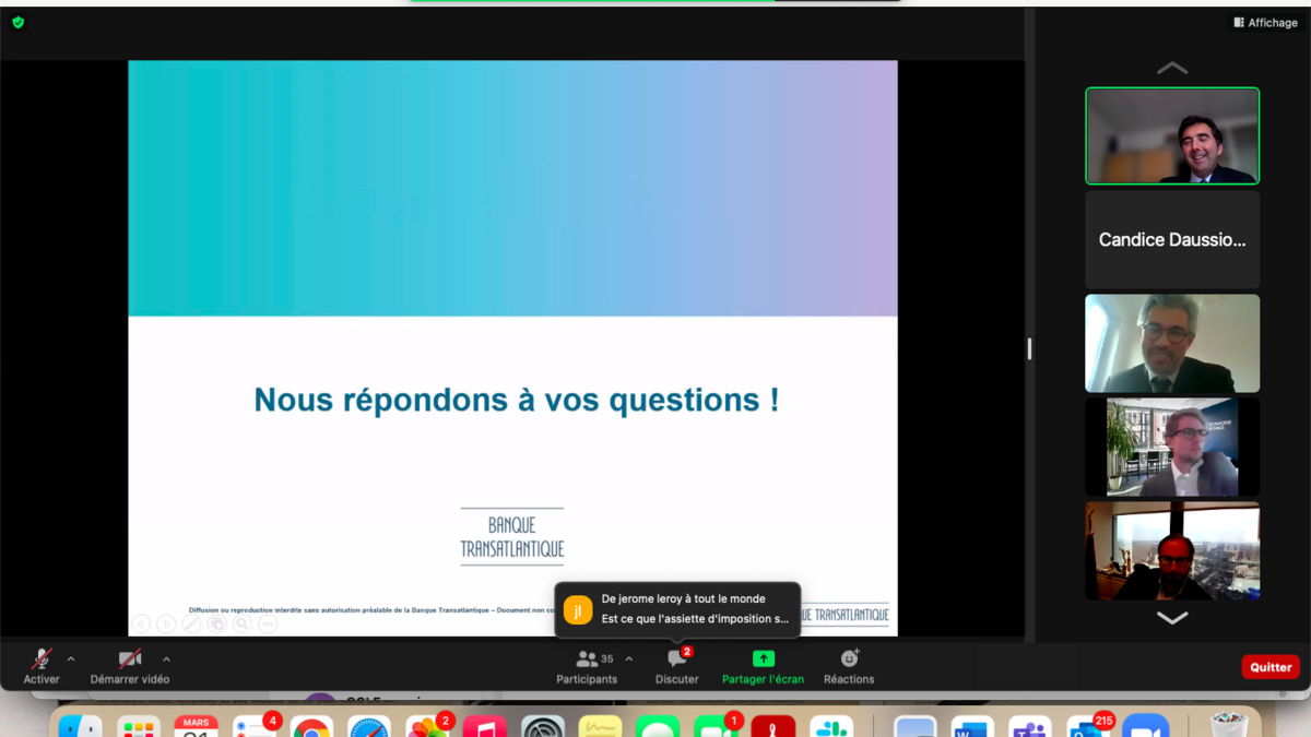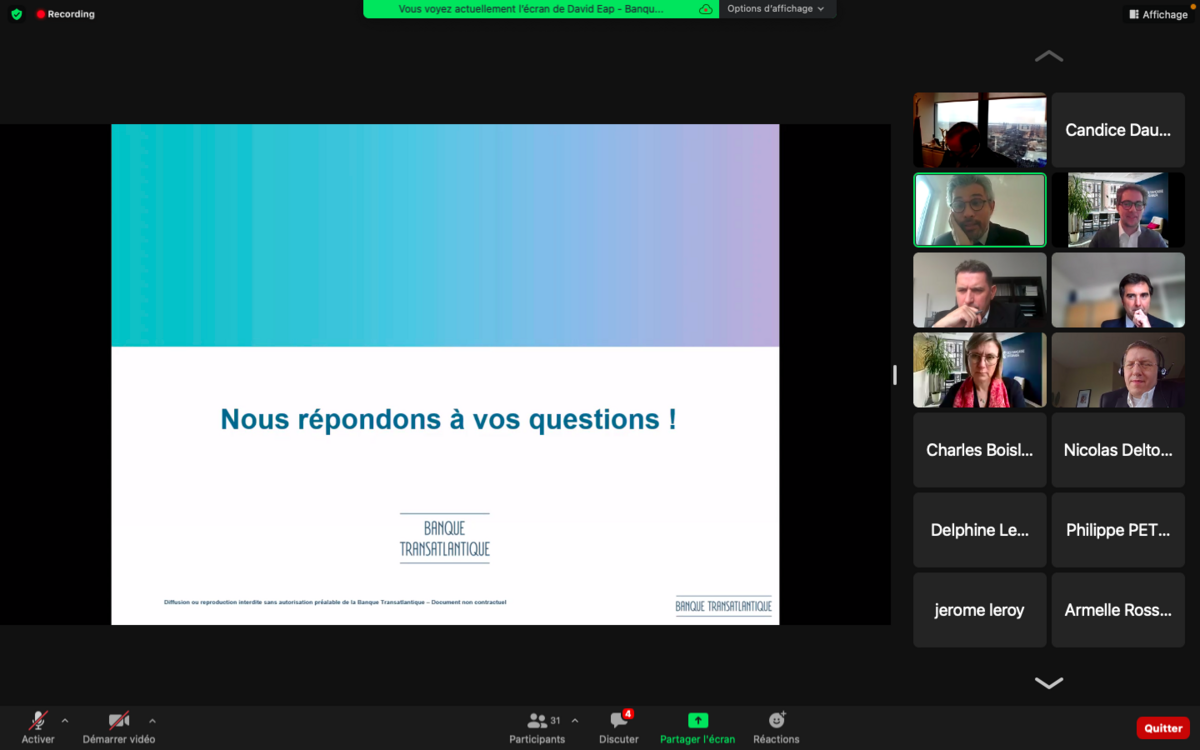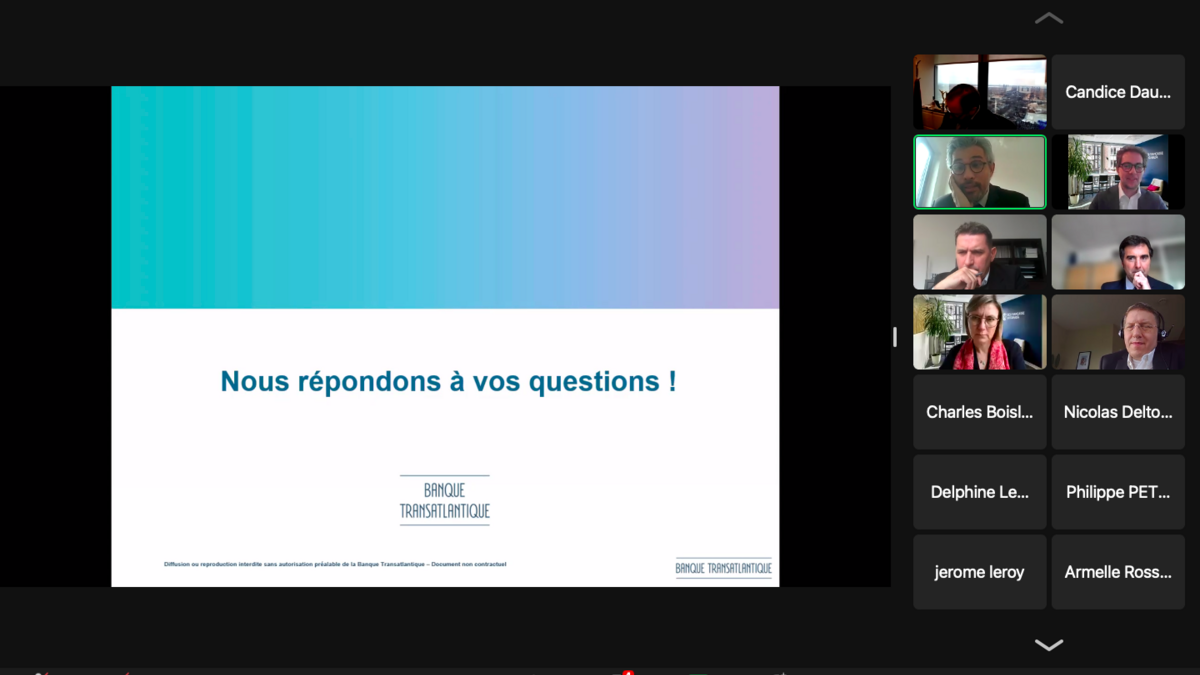 Ce fut un succès ! Jeudi 31 mars, une trentaine de participants se sont retrouvés autour d'un webinaire donné par nos experts Banque Transatlantique