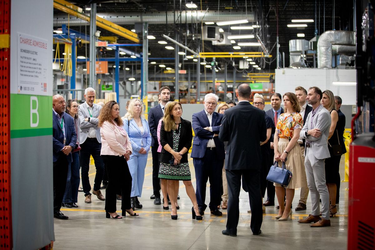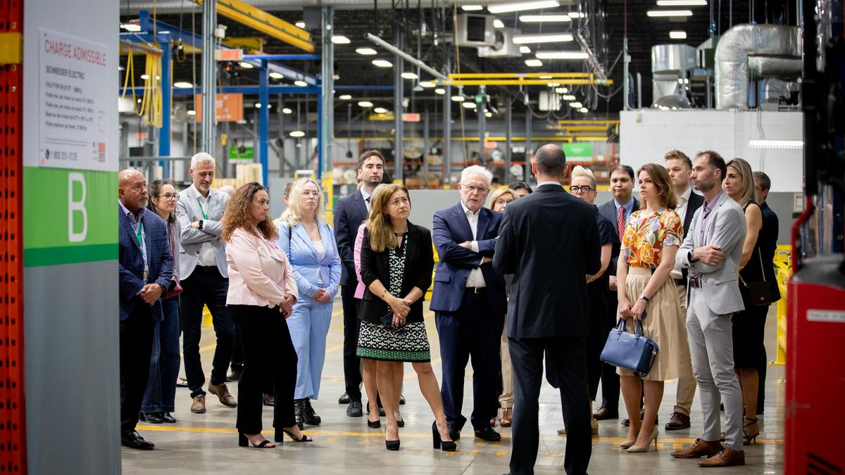 Francis Repka, président de la CCI Française au Canada, et Claire de Bailliencourt, Directrice relations membres et partenariats, ont eu l’occasion de découvrir la nouvelle ligne de production, dédiée à la fabrication locale d’équipements électriques avancés. Celle-ci illustre pleinement l’engagement de Schneider Electric en faveur de l’innovation, de la souveraineté énergétique et du développement durable.