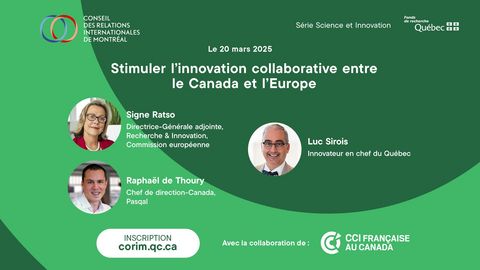 Le 20 mars 2025, le Conseil des relations internationales de Montréal (CORIM) organise un déjeuner-causerie intitulé « Stimuler l’innovation collaborative entre le Canada et l’Europe ». Cet événement réunira des experts pour discuter des opportunités de partenariats internationaux en matière de recherche et d'innovation.