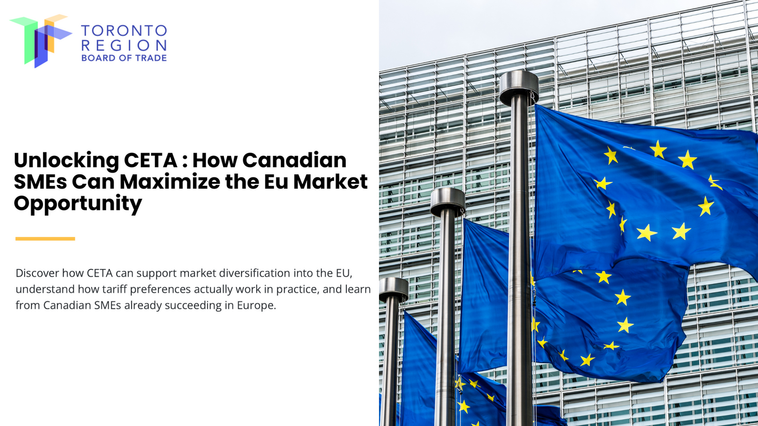 This webinar will take place on February 4, 2026, from 12:00 PM to 1:00 PM (ET) and will be held virtually. Organized by the Toronto Region Board of Trade, it focuses on how Canadian businesses can leverage CETA to generate tangible commercial opportunities in the European market.