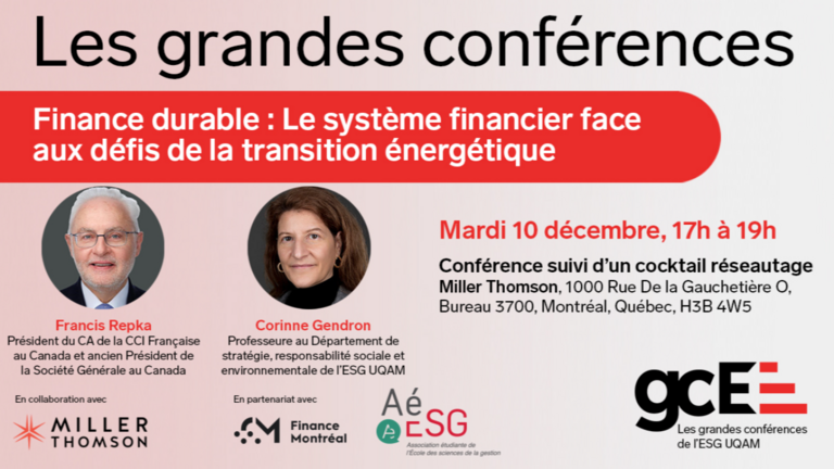 Assistez à la conférence de l'ESG UQAM sur le thème de la Finance durable et transition énergétique, avec Francis Repka et Corinne Gendron !