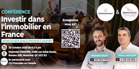 La CCI française au Canada vous invite à une conférence exclusive dédiée à l’investissement immobilier en France, organisée en partenariat avec Acheterpourlouer et Montréal Accueil. Cette rencontre se tiendra le 30 octobre 2025, de 17h à 19h, au Montréal COWORK (4388 rue Saint-Denis, Bureau 200, Montréal, QC H2J 2L1).