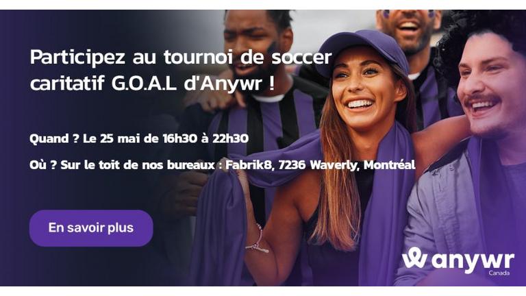 Anywr et ses partenaires vous invitent à la toute première édition de son tournoi de soccer caritatif G.O.A.L., le 25 mai 2023 !