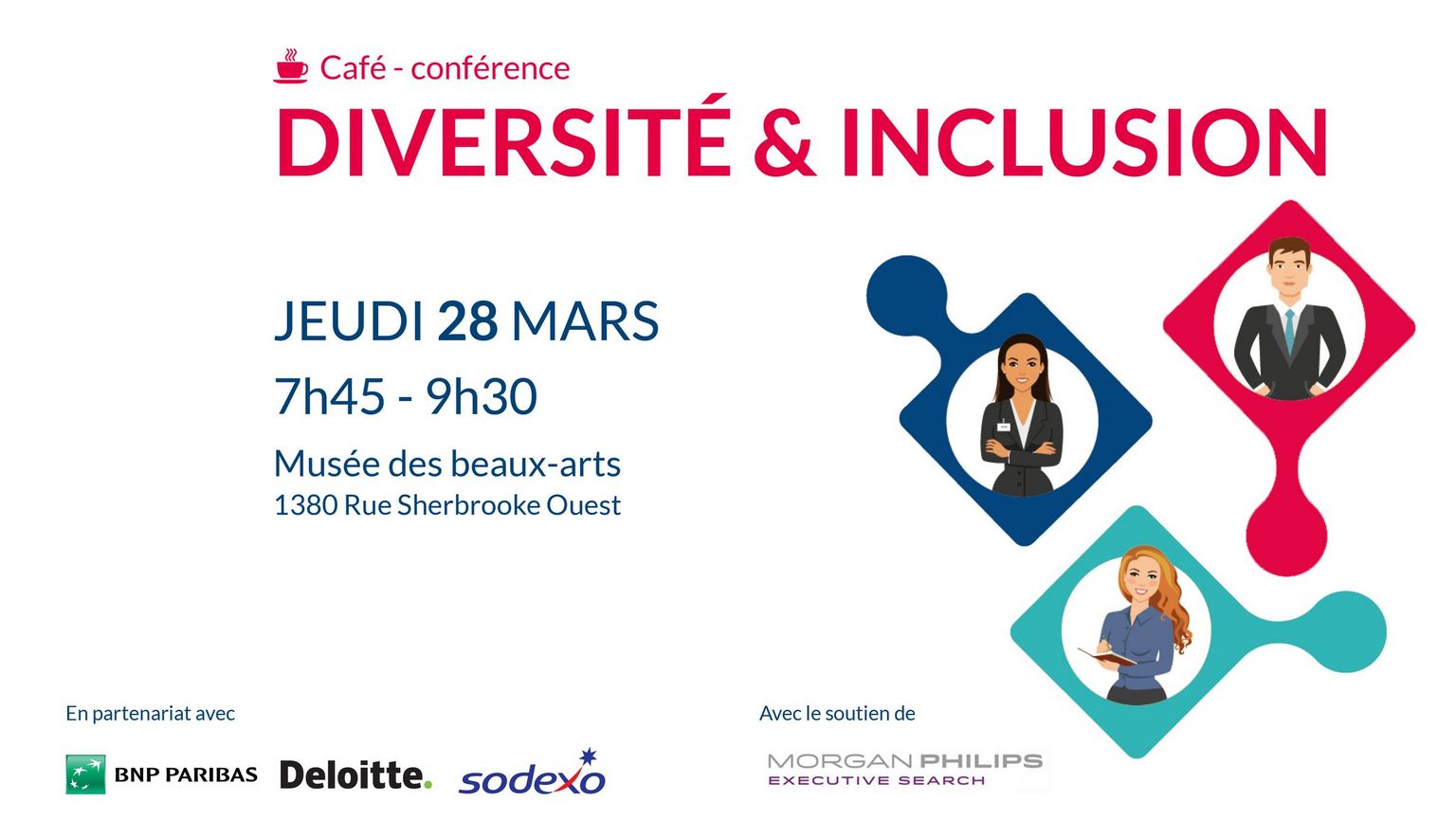 BNP Paribas, Deloitte et Sodexo travaillent de concert pour présenter et répondre aux problématiques liées à la diversité et l'inclusion en entreprise. Venez découvrir un état des lieux de Deloitte suivi des bonnes pratiques de Sodexo, le premier employeur français au Canada, ainsi que la stratégie de déploiement et de sensibilisation de BNP Paribas. Conférence au Musée des beaux-arts. Événement réalisé avec le soutien de Morgan Philips.