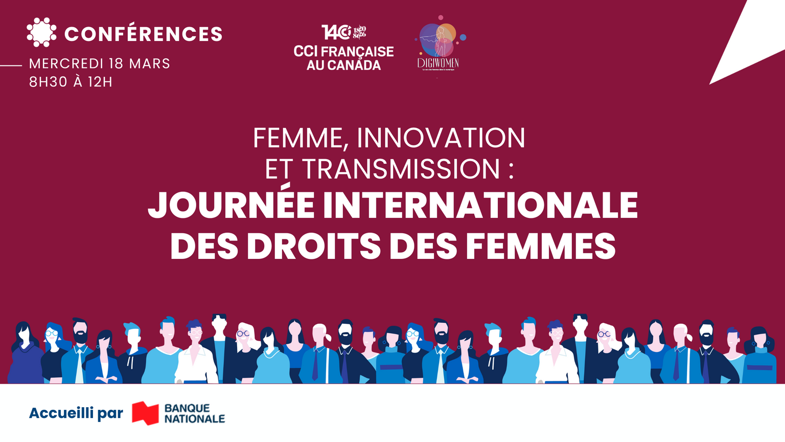 À l’occasion de la Journée internationale des droits des femmes, la CCI française au Canada, en collaboration avec DigiWomen, vous donne rendez-vous le 18 mars, de 8h30 à 12h, à la Banque Nationale du Canada, pour une matinée de réflexion, de transmission et de rencontres.
