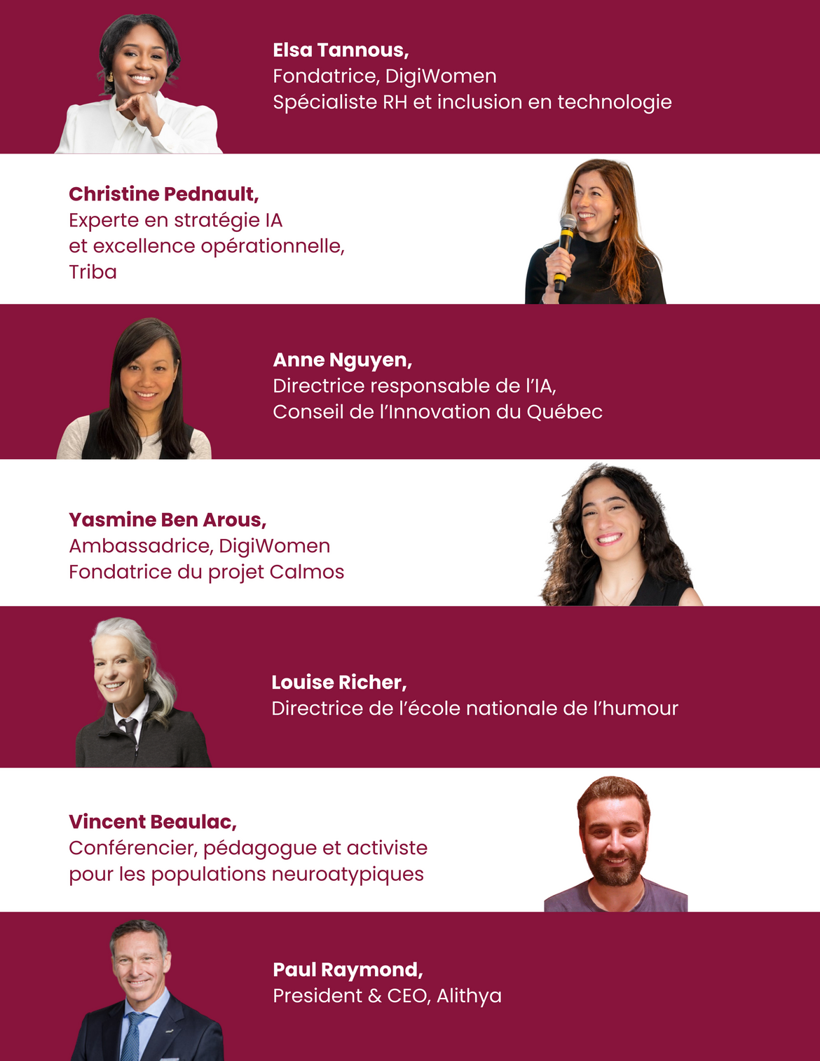 5 - Regards croisés - Femmes leaders et Hommes alliés animé par Claire de Bailliencourt, Directrice du Département Relations Membres et Partenariats. Une discussion avec Anne Nguyen, Directrice responsable IA, Conseil de l’innovation du Québec , Vincent Beaulac, Conseiller pédagogique, Elsa Tannous, Fondatrice de DigiWomen et Paul Raymond, Président & CEO, Alithya pour échanger autour de ce que l'alliance change concrètement en terme de gouvernance, d'innovation et d'impact.