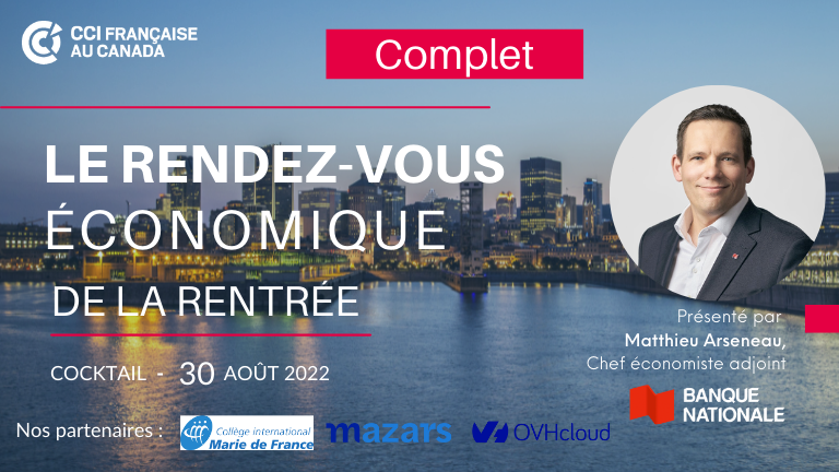 Autour d'un cocktail, la CCI Française au Canada aura le plaisir de recevoir en invité spécial Monsieur Matthieu Arseneau, Chef économiste adjoint à la BNC, pour une présentation de la situation macro-économique au Canada.