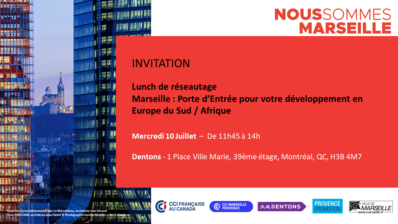 Dans le cadre de la venue de la délégation de la Ville de Marseille, la CCIFC est ravie de vous convier au lunch de réseautage du Mercredi 10 Juillet !