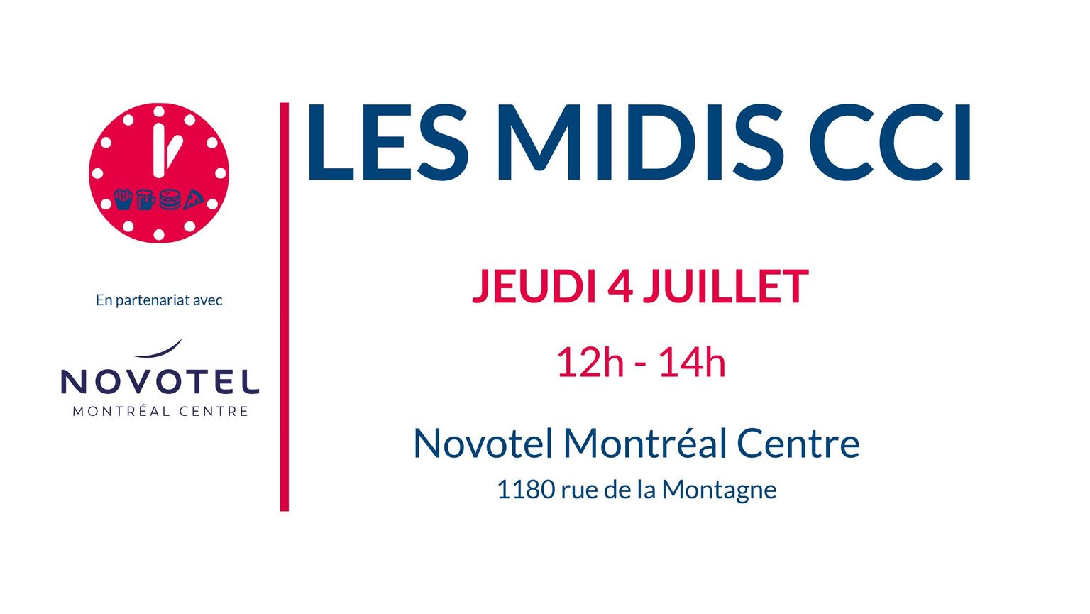 Les Midis CCI, nouveauté de 2019, sont l'occasion d'établir des relations d'affaires et de développer son réseau tout en partageant un verre et un repas. La troisième édition se déroulera au Novotel Montreal Centre, dans la salle Paris.