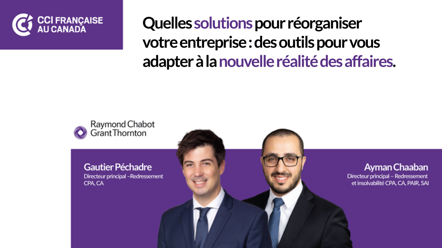 Lors de ce webinaire, nos experts vous présenteront les principaux outils de restructuration (dont les lois sur l’insolvabilité), en mettant l’accent sur les avantages souvent méconnus d’y avoir recours ainsi que sur les différentes responsabilités des administrateurs. Ils vous suggèreront également des pistes pour bien aborder les relations avec vos partenaires (clients ou fournisseurs) faisant face à des défis financiers dans un contexte de crise internationale.