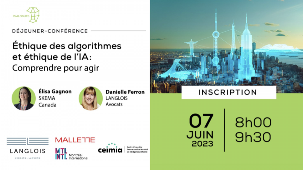 Consacrée à l’éthique de l’IA, la rencontre du 5 juin 2023 réunira Élisa Gagnon, Professeure associée à l’université Bishop et Directrice Formation exécutive et applications d’affaires de SKEMA Canada et Me Danielle Ferron, Avocate associée, Langlois Avocats