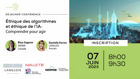 Consacrée à l’éthique de l’IA, la rencontre du 5 juin 2023 réunira Élisa Gagnon, Professeure associée à l’université Bishop et Directrice Formation exécutive et applications d’affaires de SKEMA Canada et Me Danielle Ferron, Avocate associée, Langlois Avocats