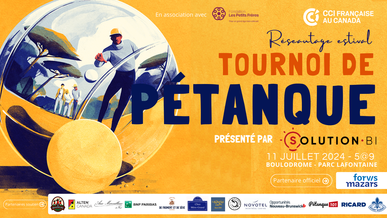 La 9ème édition du tournoi de pétanque de la CCI Française au Canada, présenté par Solutions BI, vous donne rendez-vous le jeudi 11 juillet de 5@9 au Parc Lafontaine, pour un cocktail et réseautage convivial rassemblant la communauté d'affaires franco-canadienne.