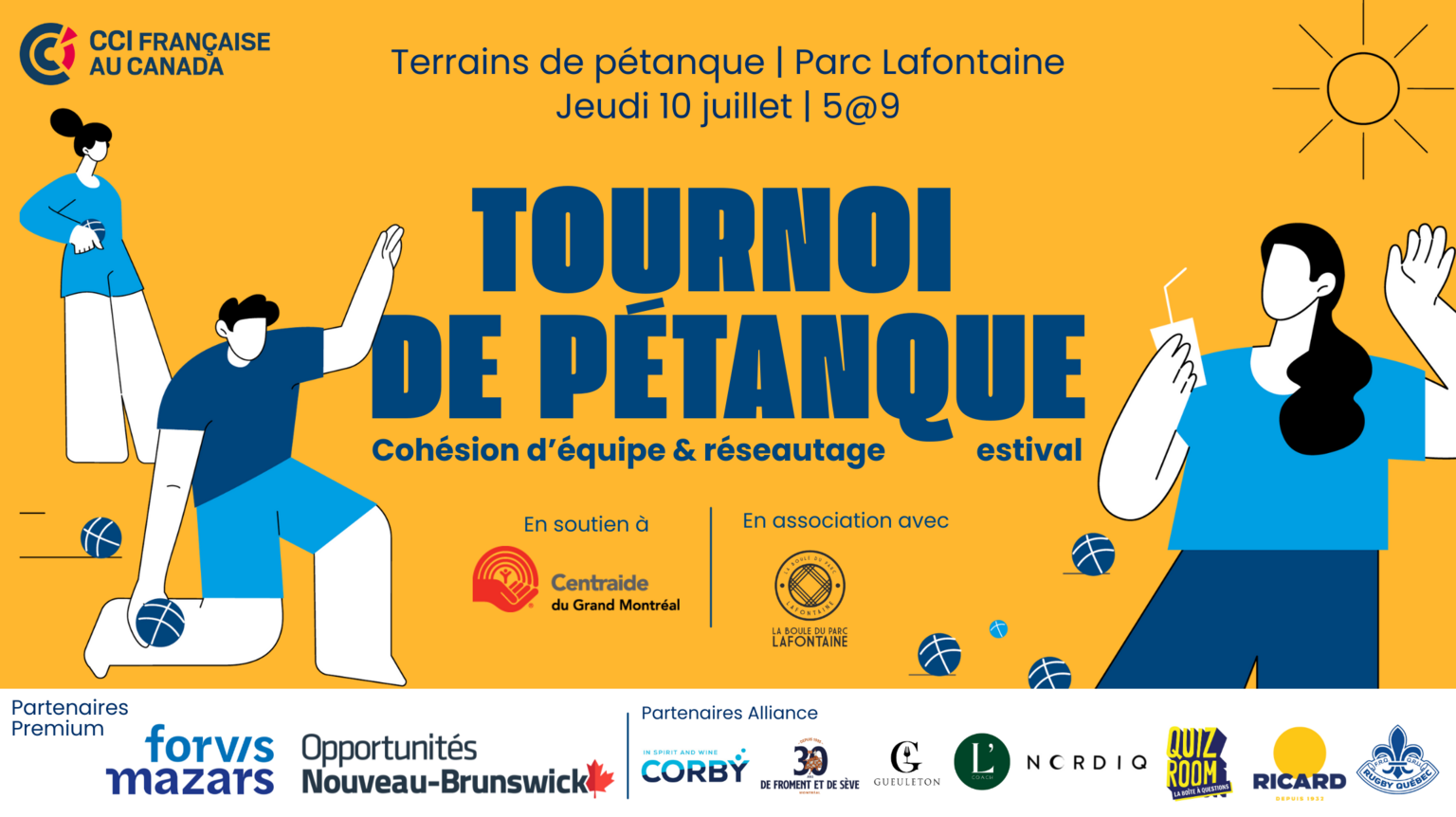 La CCI Française au Canada vous donne rendez-vous pour la 10ᵉ édition de son tournoi de pétanque emblématique, au cœur du Parc La Fontaine.