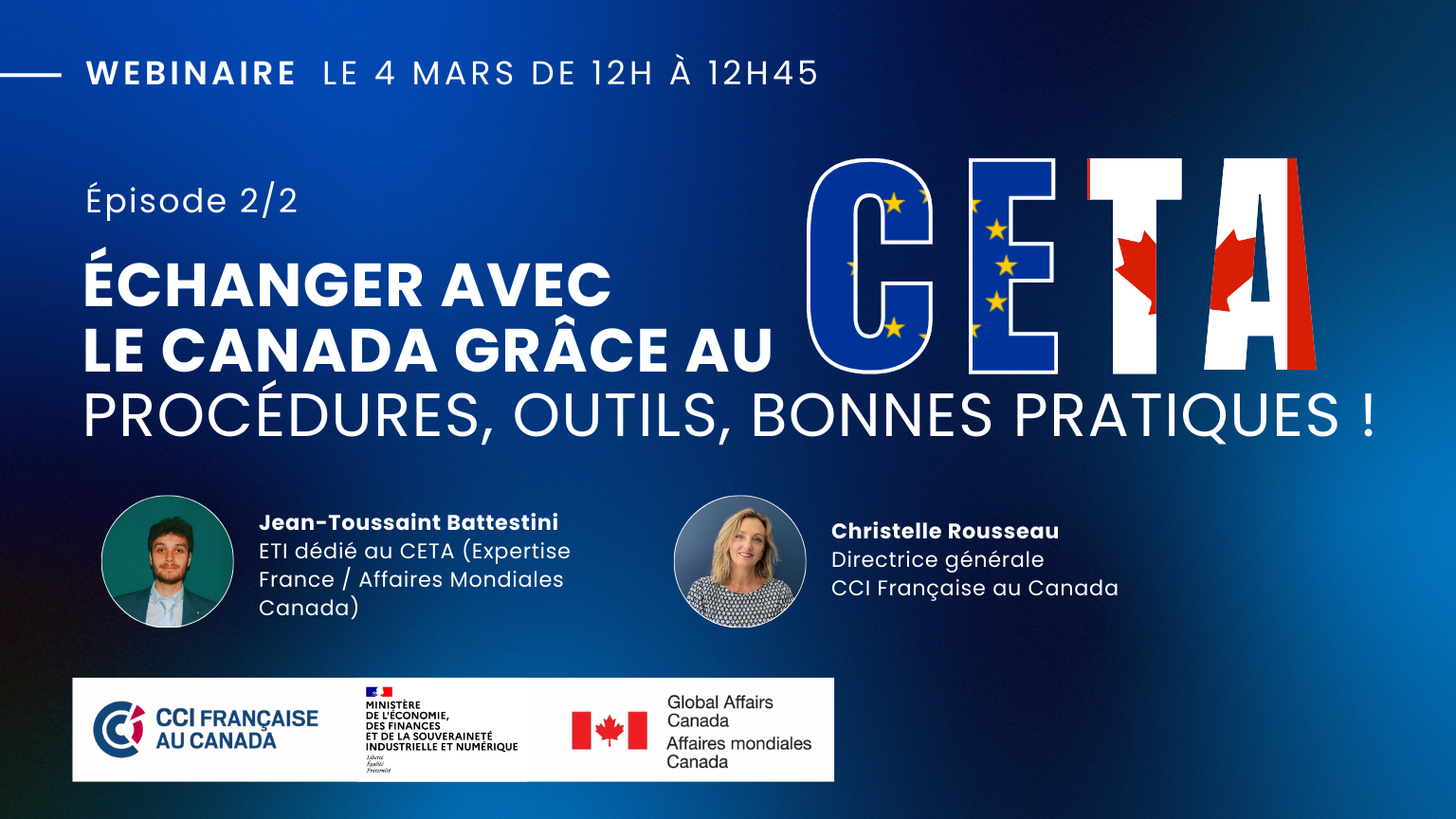 Après un premier webinaire le 18 février qui a permis de présenter le CETA et son fonctionnement pratique, la CCI française au Canada vous invite à un Atelier le 4 mars de 12h à 12h45 qui vise à présenter concrètement plusieurs cas (biens/services) et outils interactifs européens et canadiens pour naviguer de manière pratique au travers le CETA et faire gagner votre entreprise de chaque côté de l’Atlantique.