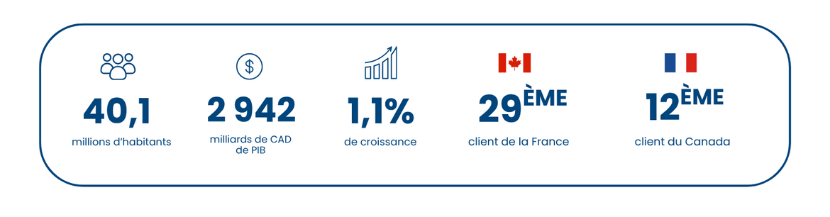 Deuxième plus vaste pays après la Russie, il compte 41,5 millions d’habitants, une population en croissance fortement portée par l’immigration. Les provinces de l'Ontario et du Québec concentrent à eux seuls 61 % des habitants et génèrent près de 60 % du PIB.